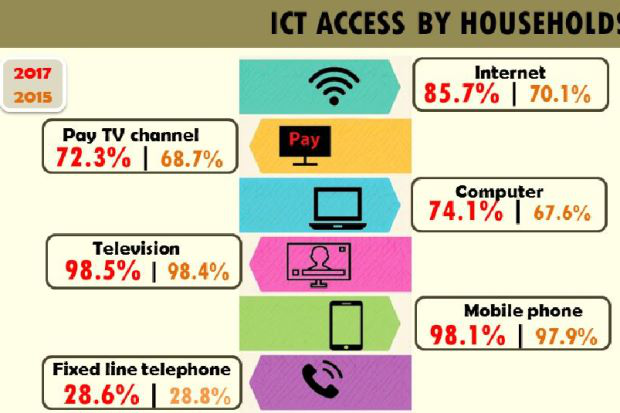 Internet access by households has increased by 15.6 percentage points to 85.7% in 2017 compared with 70.1% in 2015, according to the Statistics Department.